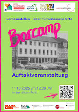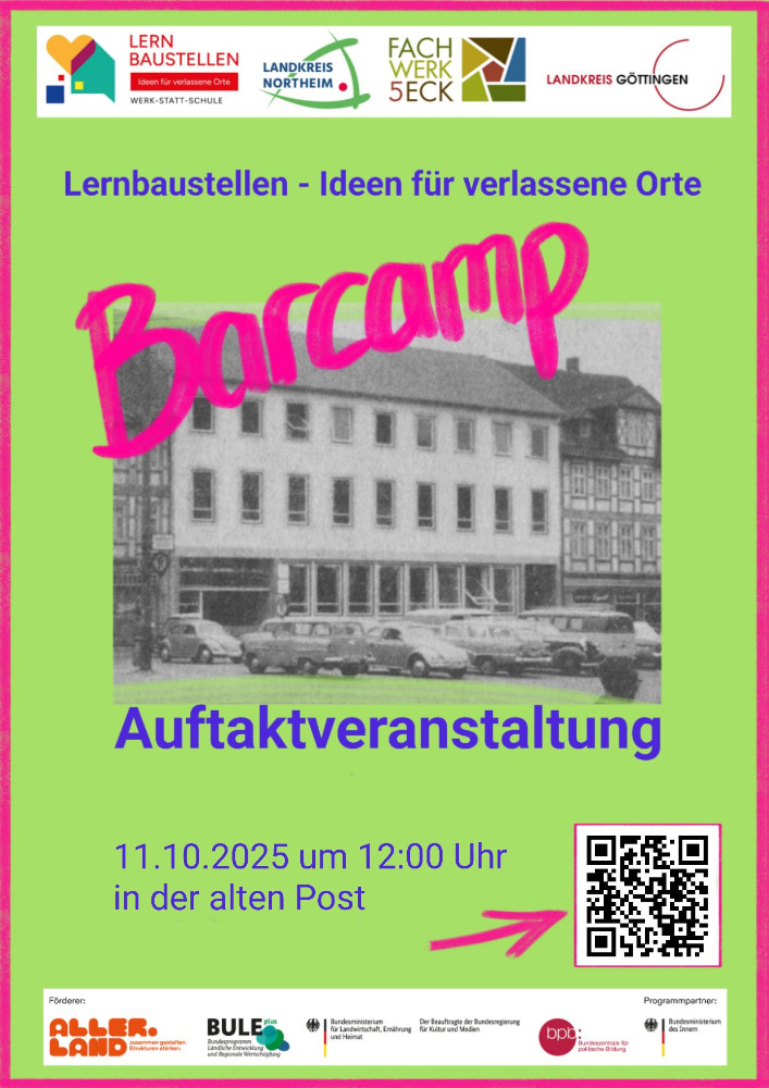 Die Werk-statt Schule lädt am 11.10.2025 um 12 Uhr nach Osterode zum Barcamp "Lernbaustellen - Ideen für verlassene Orte" ein. Die Veranstaltung findet im Leerstand "Alte Post" (warm anziehen!), Kornmarkt 15, 37520 Osterode statt. Willkommen sind alle Interessierten.